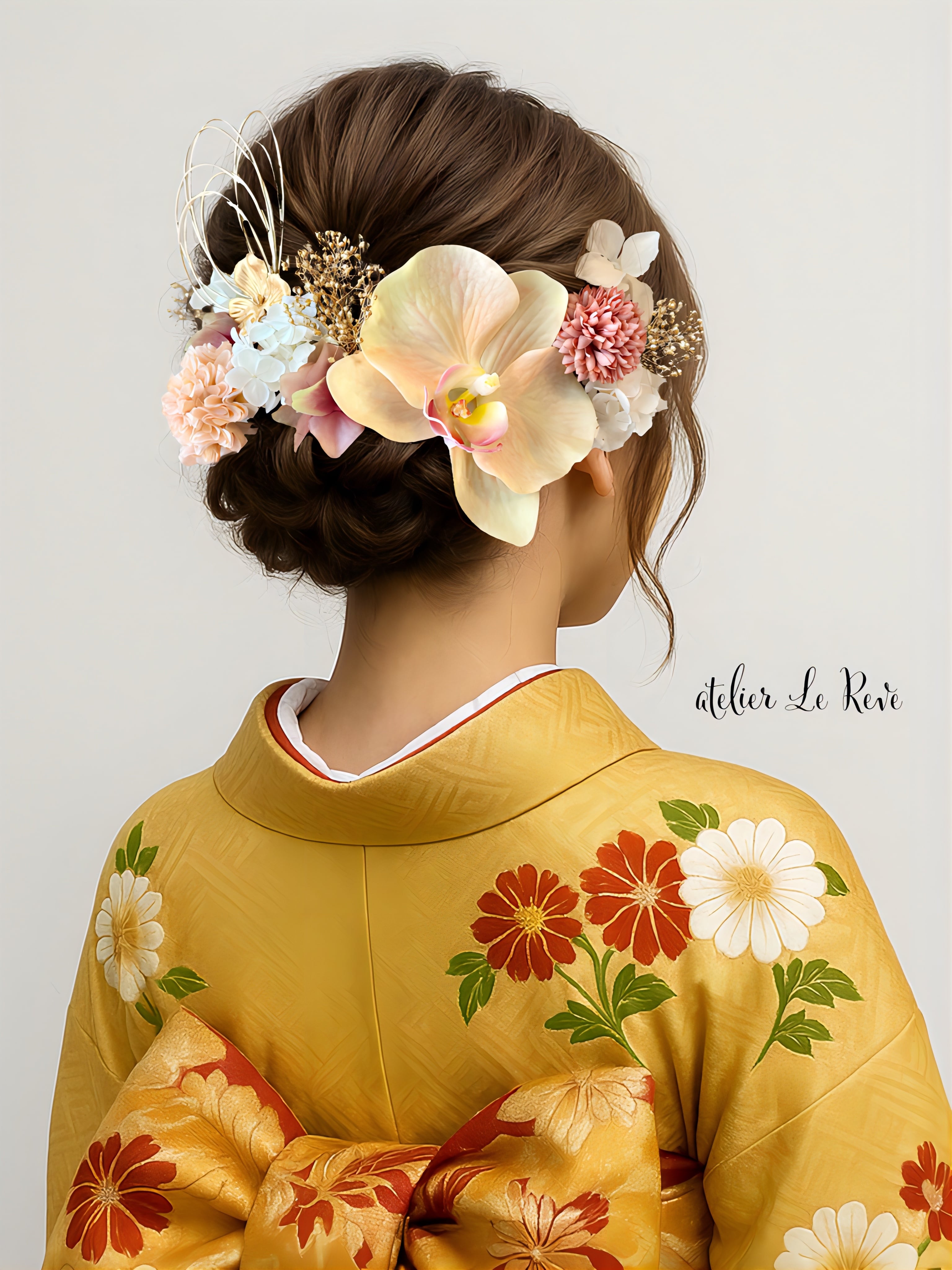柔らかなバターイエローの胡蝶蘭が主役の髪飾りは陽だまりのように温かみのある印象を与えます。