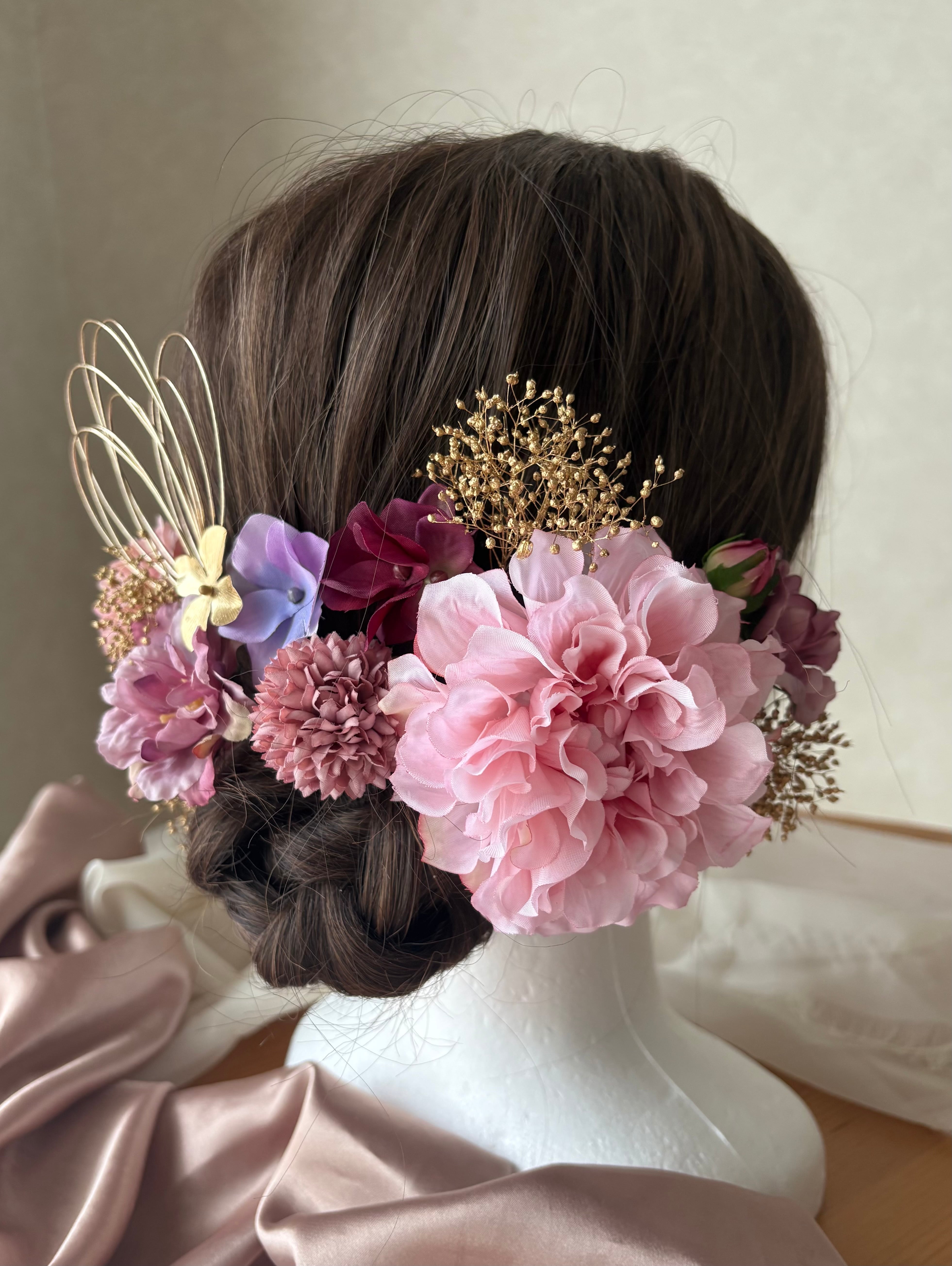 柔らかく優しいライトピンクのダリアをポイントにラベンダーカラーやワインレッドの花材を合わせた華やかさと可憐さを兼ね備えた髪飾り