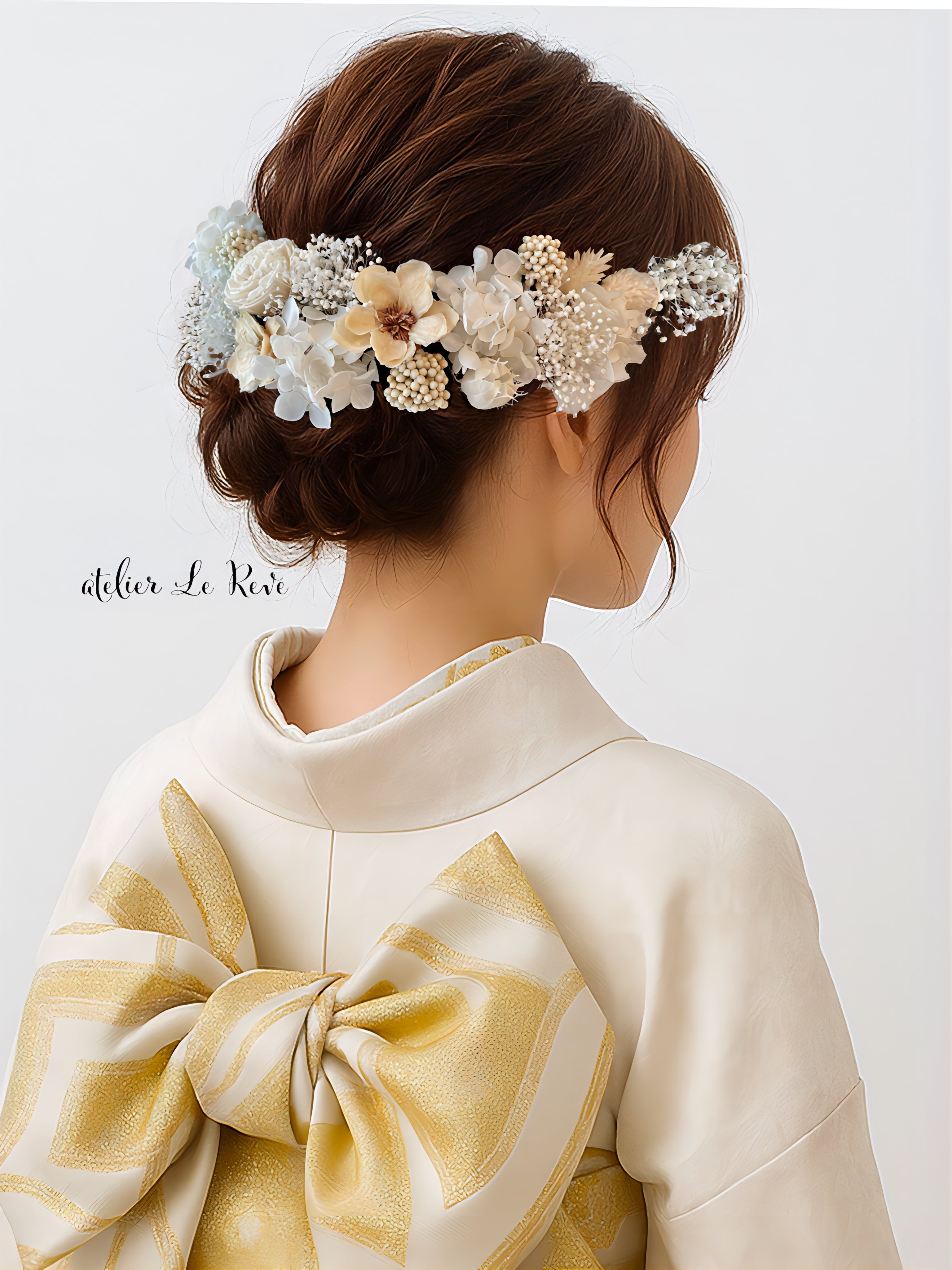 生花の風合いを残した優雅なプリザーブドフラワーとナチュラルな雰囲気のドライフラワーを組み合わせた髪飾りになっております。