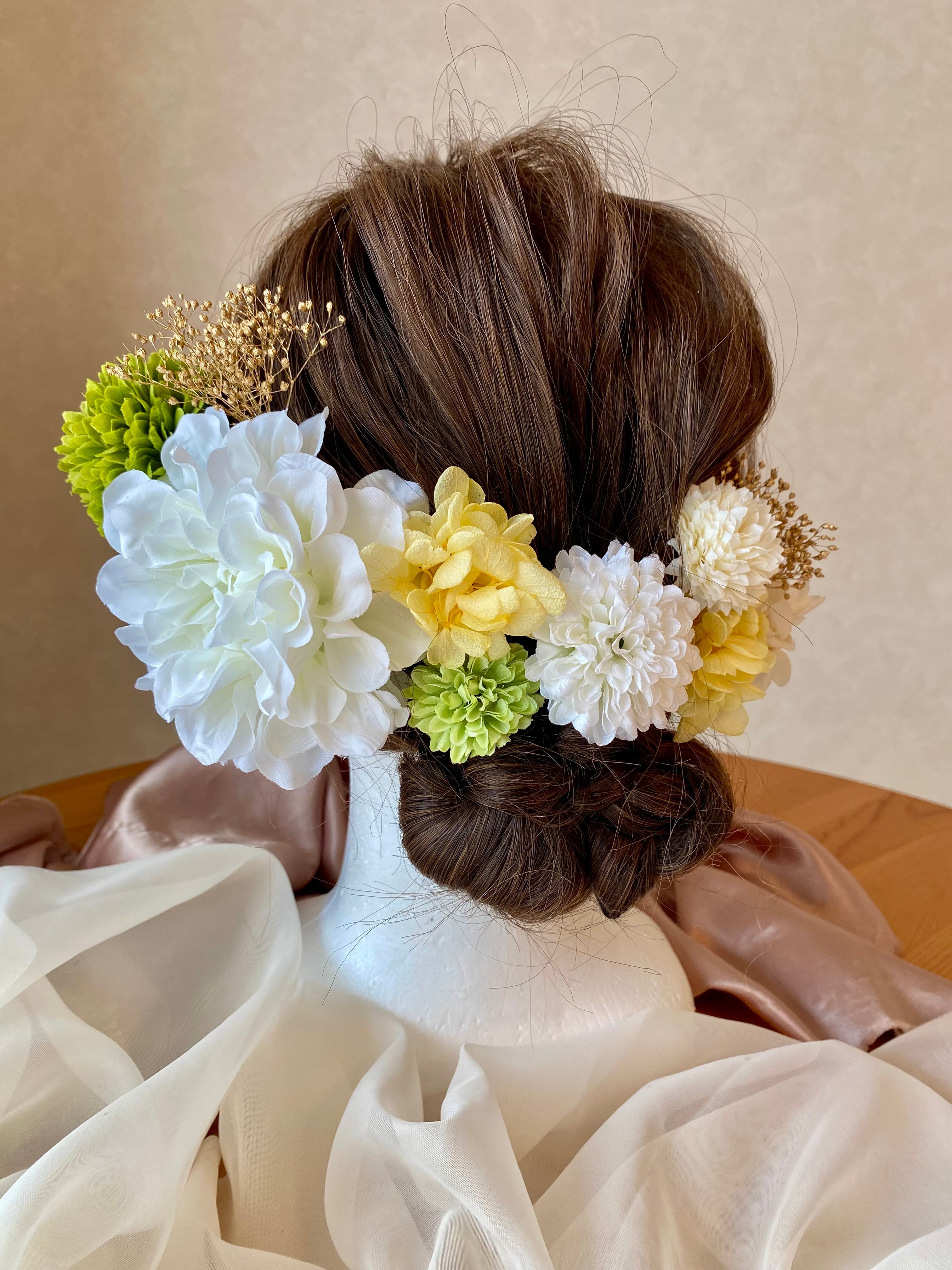 やわらかな彩りを添える黄色のアジサイを合わせた髪飾り。