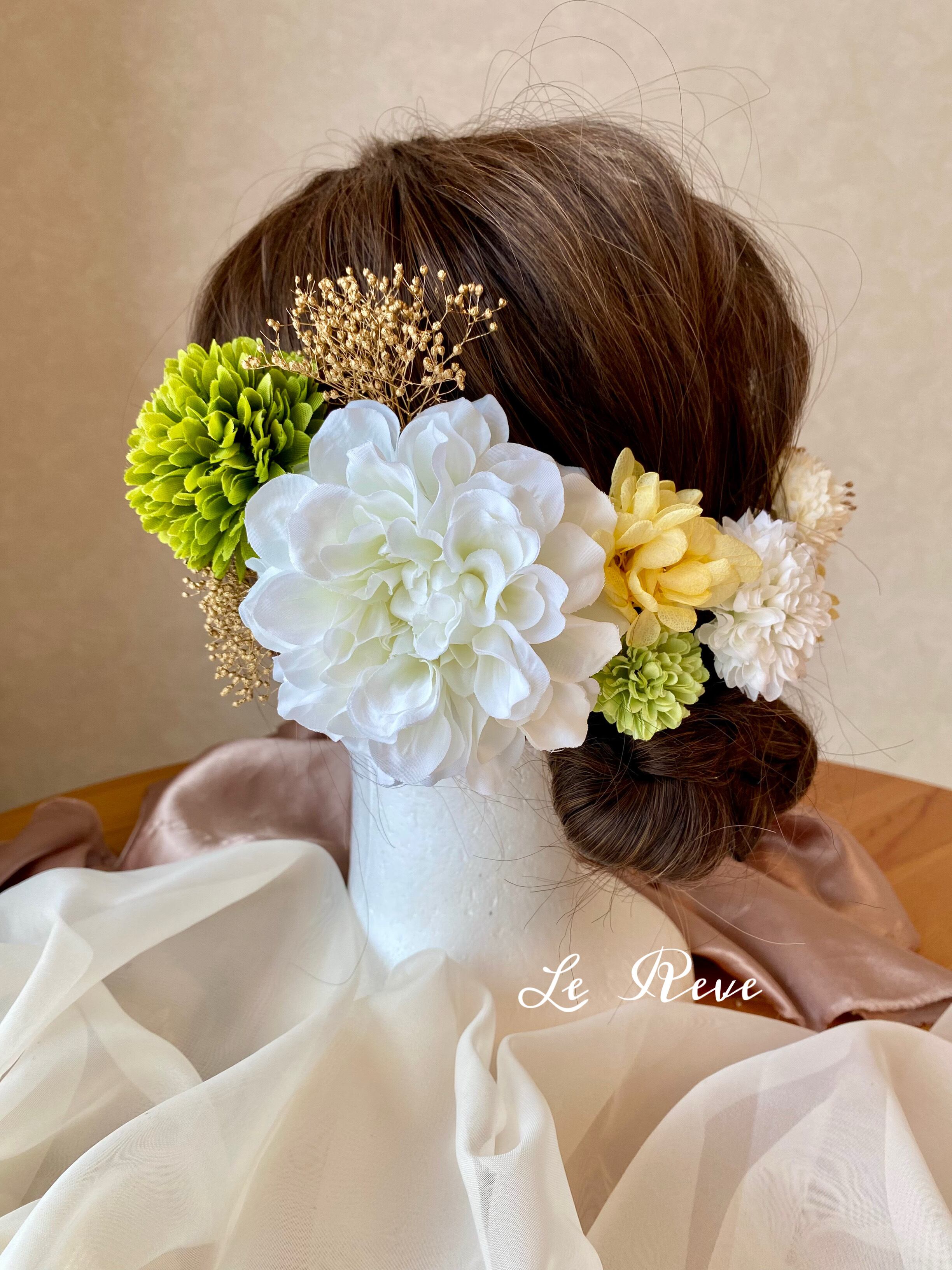 W03 白ダリア(大)とグリーンマムの髪飾り