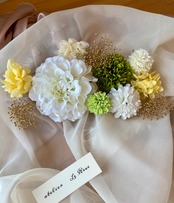 上質な有名ブランドのアーティフィシャルフラワーの他、生花の風合いを残した優雅なプリザーブドフラワーを組み合わせた髪飾りになっております。