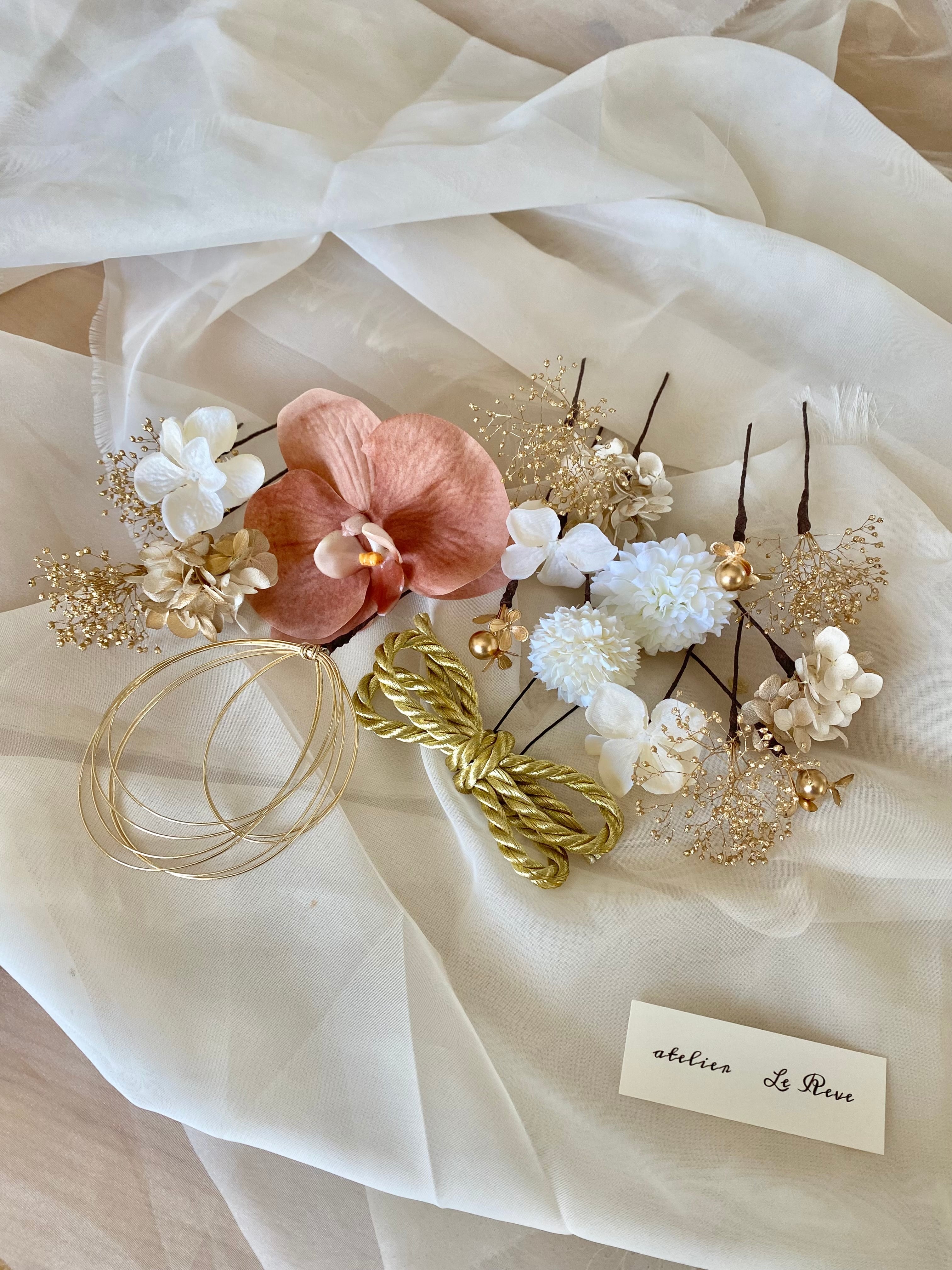 上質な有名ブランドのアーティフィシャルフラワーの他、生花の風合いを残した優雅なプリザーブドフラワーを組み合わせた髪飾りになっております。