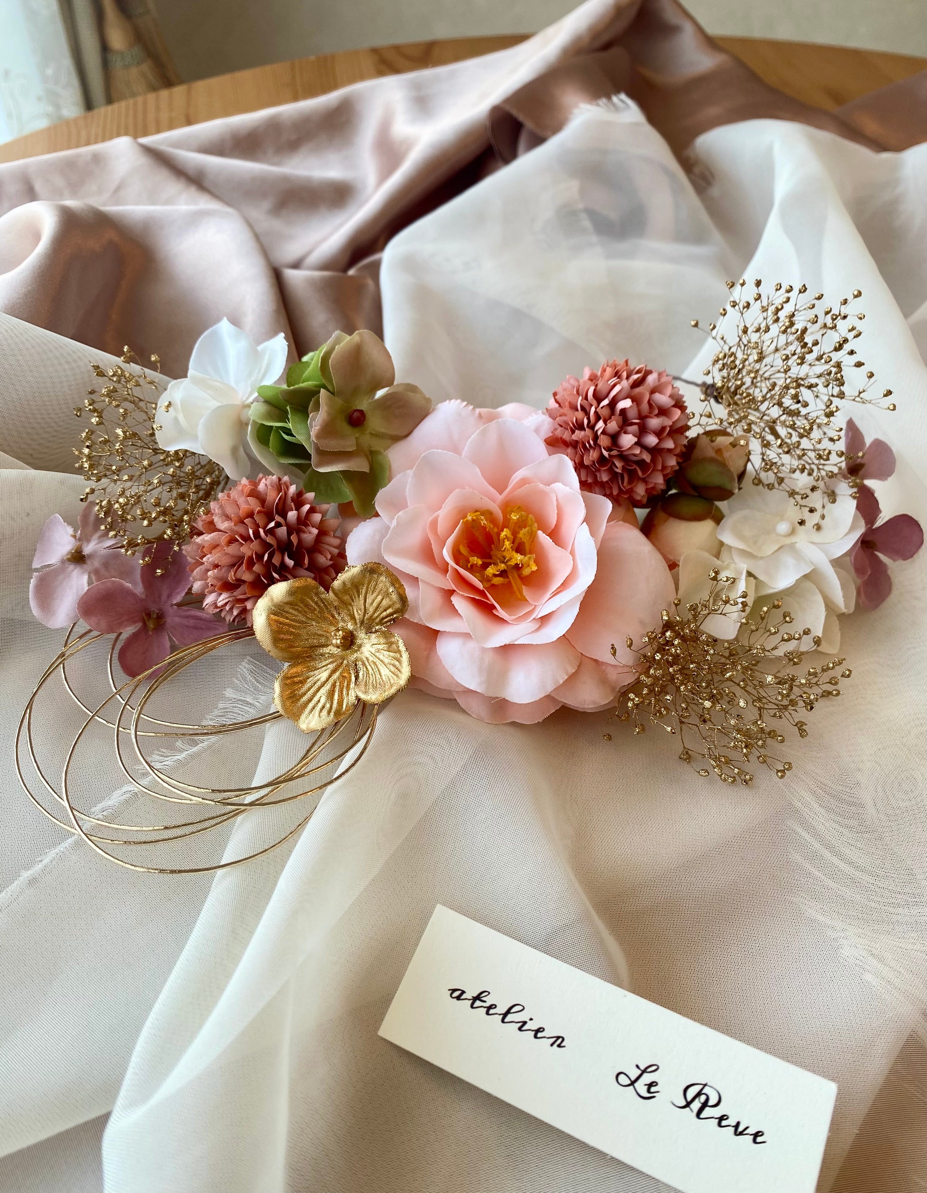 上質なアーティフィシャルフラワーと生花の風合いを残した優雅なプリザーブドフラワーを合わせた髪飾りです。