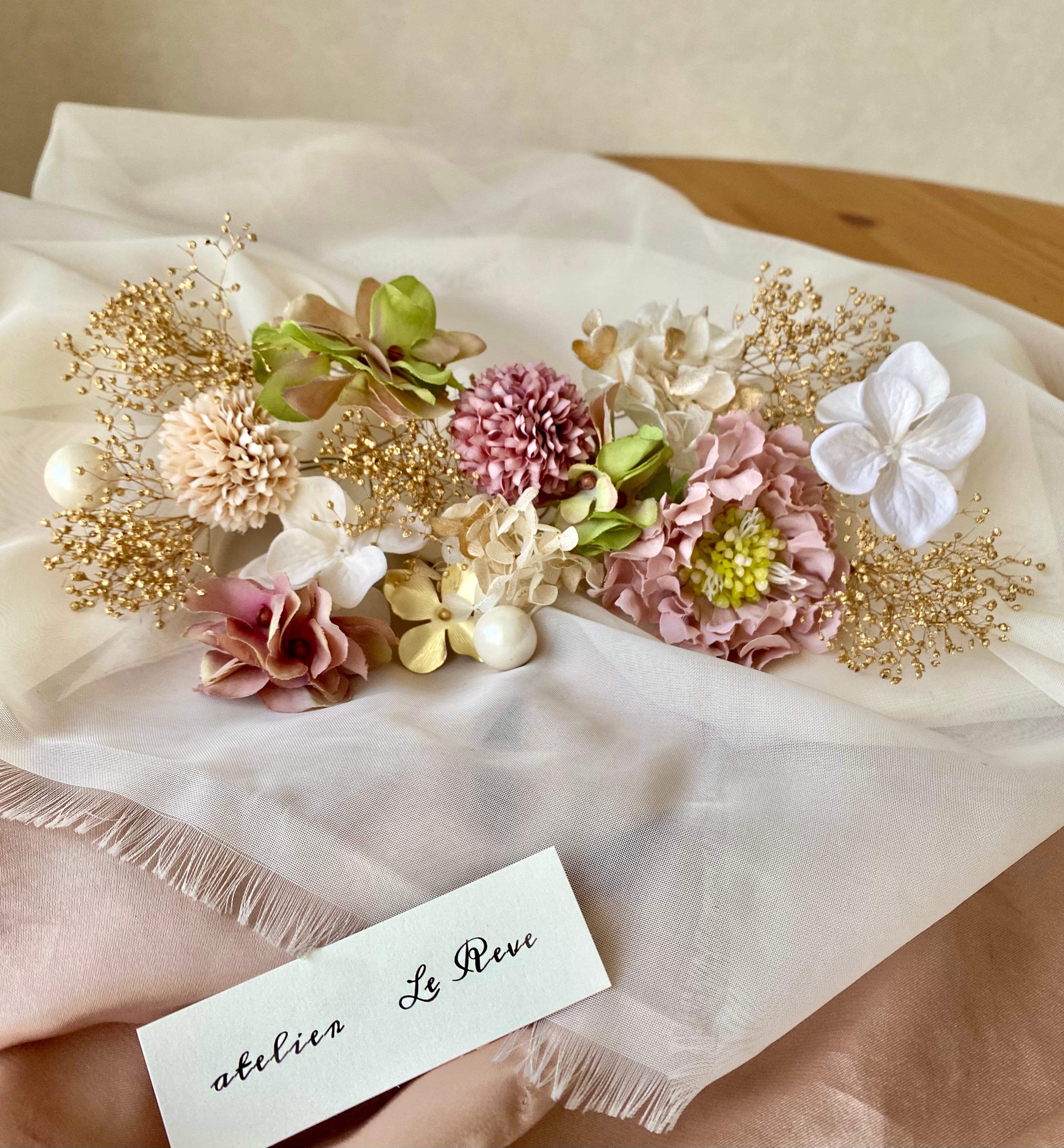 上質なアーティフィシャルフラワーと生花の風合いを残した優雅なプリザーブドフラワーを組み合わせた髪飾りになっております。
