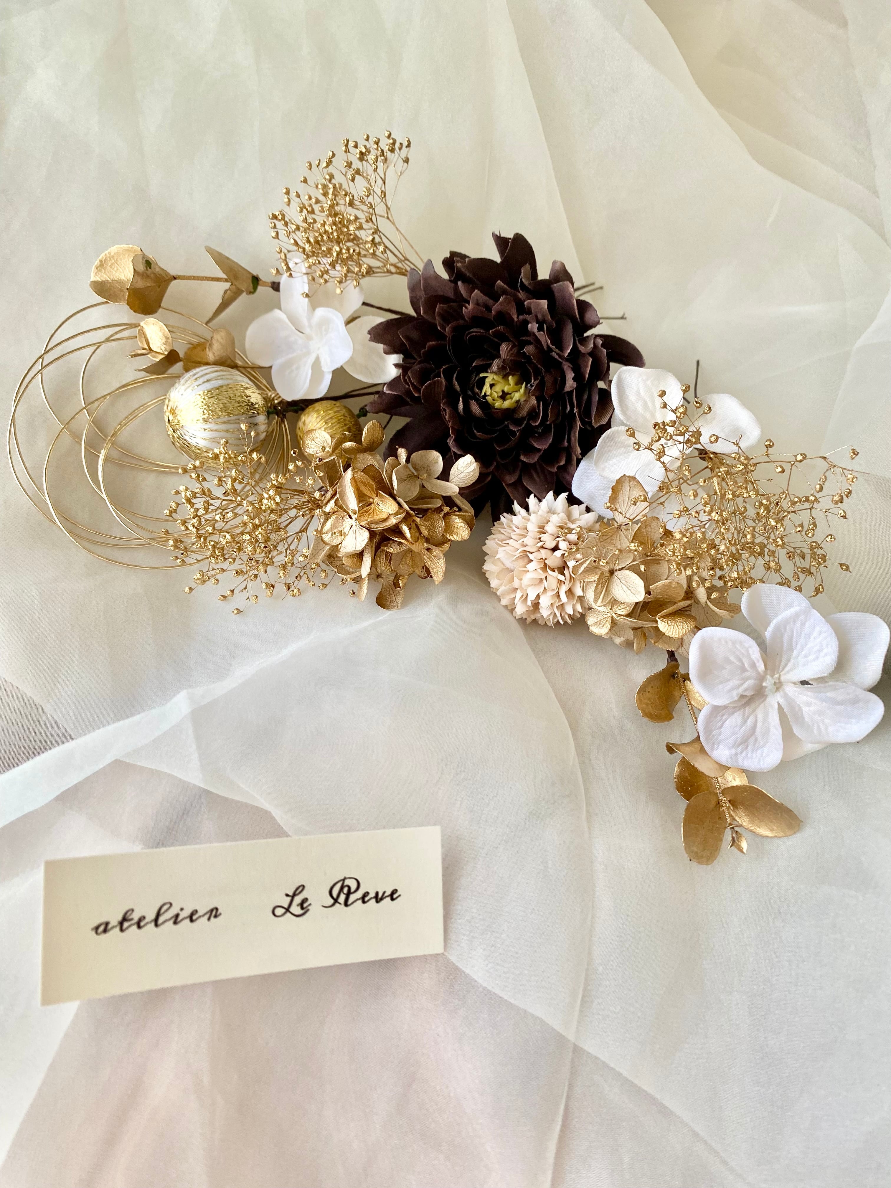 ひときわシックなブラウンマムをポイントにベージュやホワイト、ゴールドを合わせた洗練された大人かっこいい髪飾りです。